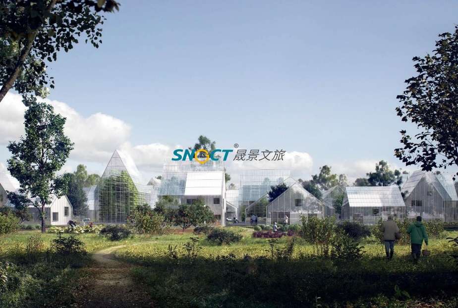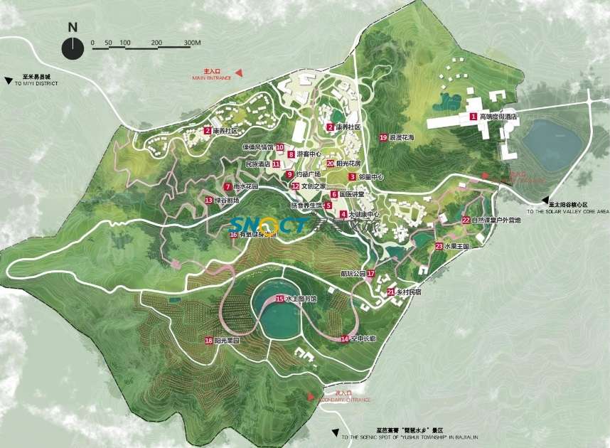復(fù)雜的河谷沖溝地形與嚴(yán)苛的干熱河谷氣候是本項(xiàng)目最大的設(shè)計(jì)挑戰(zhàn),規(guī)劃通過日照光環(huán)境、氣溫、降雨、風(fēng)環(huán)境等條件,進(jìn)行合理化的規(guī)劃布局、制定建筑設(shè)計(jì)策略以及創(chuàng)新引入雨洪管理系統(tǒng),解決當(dāng)?shù)囟燃倏叼B(yǎng)、娛樂休閑等業(yè)態(tài)所必須的居住環(huán)境、景觀環(huán)景與生態(tài)環(huán)境所面臨的一些列挑戰(zhàn)。同時抓住當(dāng)?shù)貧v史文脈與地域資源,以“核心綠谷”為規(guī)劃理念,形成了以“水果之都、康養(yǎng)之城、太陽之源”為特色優(yōu)勢,以“西極昧谷,太陽之源,顓頊故里,傈僳之鄉(xiāng)”為文化主題的特色康養(yǎng)度假田園綜合體。