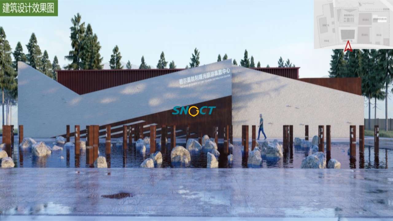 游客服務(wù)中心組團(tuán)設(shè)計:“勝利曙光”游客服務(wù)中心位于若爾蓋縣城東側(cè),距離縣城約15km,地處通往紅色革命村落門戶位置。服務(wù)中心場地基本硬化平整,場地西側(cè)有紅色革命雕塑廣場,場地內(nèi)現(xiàn)設(shè)有小車位45個,特產(chǎn)售賣商店等;建筑景觀風(fēng)貌欠佳,功能較為混亂。計劃在原有舊址基礎(chǔ)上對游客服務(wù)中心進(jìn)行整體化設(shè)計,新建游客中心,進(jìn)行建筑風(fēng)貌改造。融入紅色文化,融合草原雪山的設(shè)計元素,以硬朗的建筑輪廓寓意紅軍過草地的艱苦頑強(qiáng),亢勇不屈的長征精神。